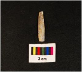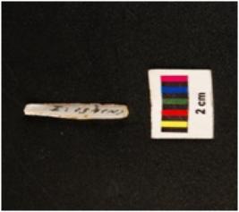 | Description / विवरण | Chalcedony blade with prominent mid ridge, triangular in section, broken at distal and proximal end. |