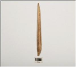 | Description / विवरण | A point made on bone, one end is sharp pointed and other one is thicker, smooth surface, brown in colour, well polished surface. |
