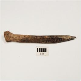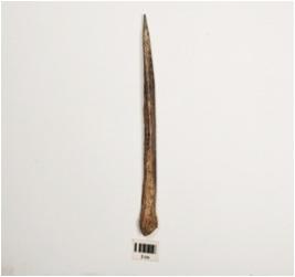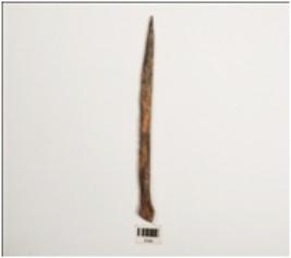 | Description / विवरण | A point made on bone, one end is sharp pointed and other one is thicker, dark brown in colour, well polished surface. |