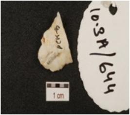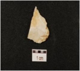 | Description / विवरण | A utilized flake made on chalcedony, flake scars on dorsal side, broken on distal end and use wear marks along cutting edge. |