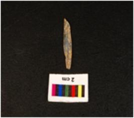 | Description / विवरण | Microlithic blade with prominent mid ridge on dorsal side, triangular in section, broken at distal end, diffused bulb, use wear mark along the cutting edges. |