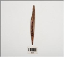 | Description / विवरण | A point made on bone, long narrow having pointed at both ends, brown in colour, well polished surface. |