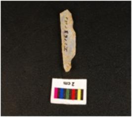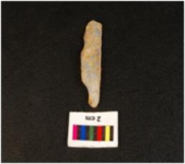 | Description / विवरण | Parallel sided blade with prominent mid ridge, triangular in section, broken at distal end, bulb on ventral, use wear along the cutting edges, covered with dust. |
