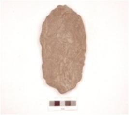 | Description / विवरण | Handaxe made on quatzite end struck flake, plano-convex in cross section, bulb absent and wavy working edge. |