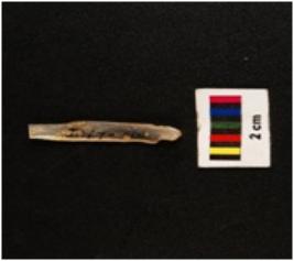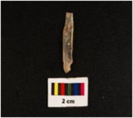 | Description / विवरण | Blade with two prominent flake scar on dorsal side. Positive bulb on proximal end with striking platform, distal end broken. |