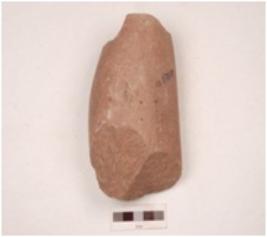 | Description / विवरण | Chopping tool made on quartzite pebble, biconvex in cross section and flake scars along the cutting edge. |