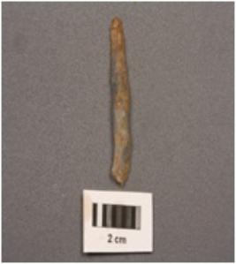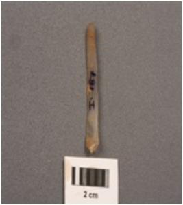 | Description / विवरण | Parallel sided microlithic blade with a ridge on dorsal side, diffused bulb on ventral side, partly broken along at distal end, triangular in section and made by using cristal guided ridge technique. |