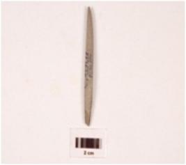| Description / विवरण | Fragment of pointed arrow head stone, rectangular in section, greyish colour, smooth surface. |