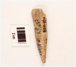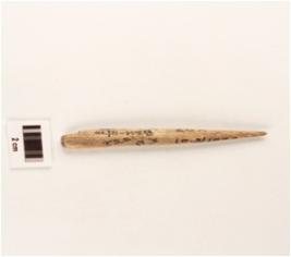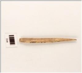 | Description / विवरण | Bone tool, pointed end slightly broken, smooth surface. |