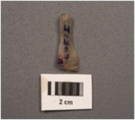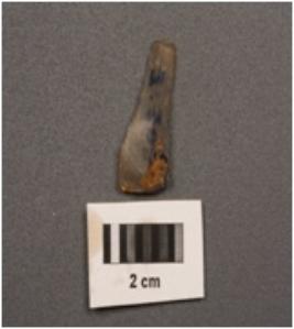 | Description / विवरण | A microlithic blade with two ridges on dorsal side, prepared platform, diffused bulb on ventral side, broken at distal end, trapezoidal in section and use wear marks on cutting edges. |