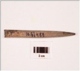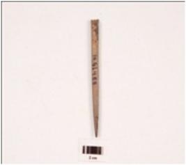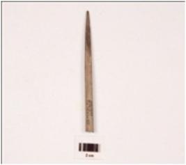 | Description / विवरण | A stone point with square cross section, polished surface and broken from the thick end. |