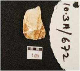 | Description / विवरण | A flake made on chalcedony, bladescars on dorsal side, prominent bulb on ventral side and broken on distal end. |