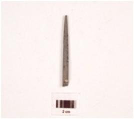 | Description / विवरण | An elongated stone point, tip is fragmented, charcoal black in colour, broken from bottom, natural incised lines on the surface, conical in shape. |