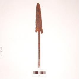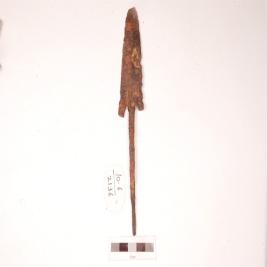 | Description / विवरण | Leaf shaped spear head of medium size with a shallow pointed, rib in the centre on both the upper and lower surface, rhomboid section, damaged blade, a rectangular tang has been provided to fit into a bumboo staff. |