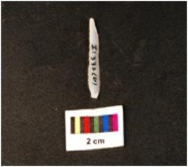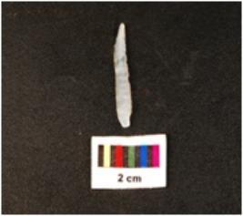 | Description / विवरण | Blade with use wear marks on working edges, ridge along dorsal surface striking platform on proximal end and a pointed distal end, positive bulb on proximal end on ventral side. |