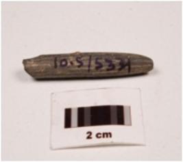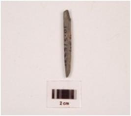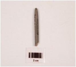 | Description / विवरण | An elongated stone point, charcoal black in colour, round section, bottom tip is slightly fragmented. |