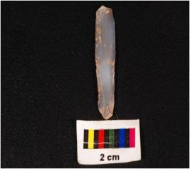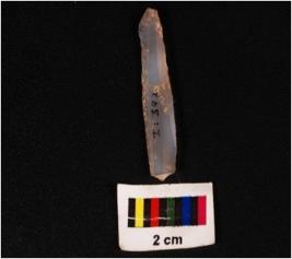 | Description / विवरण | Point with a positive bulb on proximal end, a ridge on dorsal side with use wear marks on one side. |