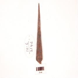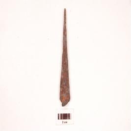 | Description / विवरण | An arrow head of rhomboid section with a prominent rib in the center, both on the upper and lower surface, it resembles a karavira leaf, a short tang of circular section has been provided to fit into a long red handle. |