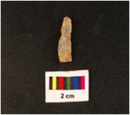 | Description / विवरण | Parallel sided chalcedony blade, irregular dorsal, use wear edges. Diffused bulb on proximal end. |
