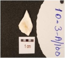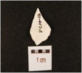 | Description / विवरण | A chert flake with prominent bulb on ventral side, prepared platform, use wear marks along the cutting edge and broken from distal end. |