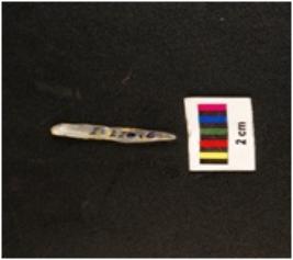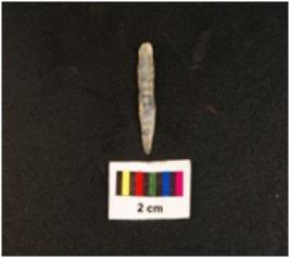 | Description / विवरण | A point made on blade with mid-ridge on dorsal side, triangular section, use wear marks along the cutting edges and diffused bulb on ventral side. |