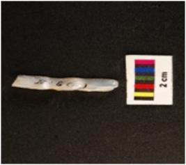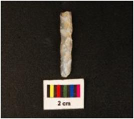 | Description / विवरण | A blade with a wavy mid-ridge on dorsal side, triangular in section, diffused bulb on ventral side, use wear marks along the cutting edges. |