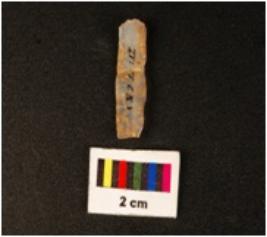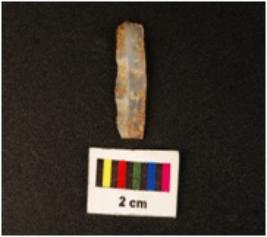 | Description / विवरण | A blade with mid-ridge on the dorsal side, blunted left edge on dorsal side, use wear marks on right cutting edge and triangular section. |