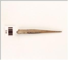 | Description / विवरण | A well prepared charred bone point, polished, proximal and distal end, smooth surface. |