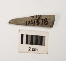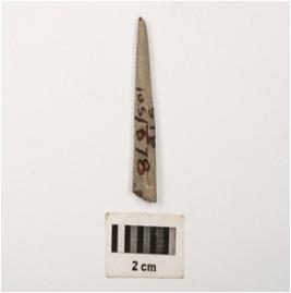 | Description / विवरण | A fragment of a point with rectangular cross section, made with himalayan soft stone, top is pointed and bottom is partly broken, well polished surface. |