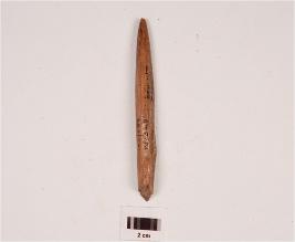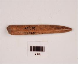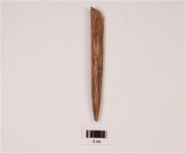 | Description / विवरण | A bone point, depression on surface, one end is pointed and another end is broken, triangle section, surface is smooth and polished, buff in colour. |