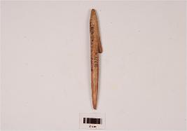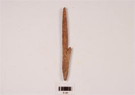 | Description / विवरण | A bone arrow head, one end is pointed and another end is flat and thick, smooth surface and polished buff in colour. |