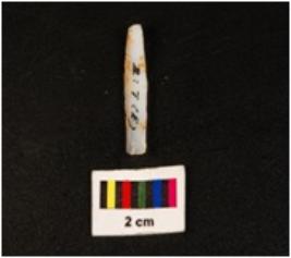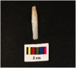 | Description / विवरण | Parallel sided blade with prominent double ridge on dorsal side, trapezoidal in section, diffused bulb on ventral side, use wear mark along the cutting edges, broken at distal end. |