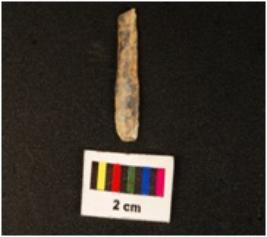 | Description / विवरण | A blade with mid-ridge on the dorsal side, triangular in section, use wear marks along the cutting edges. |