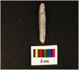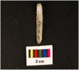 | Description / विवरण | A blade with a mid-ridge on dorsal side, triangular in section, diffused bulb on ventral side, use wear marks along the cutting edges and the raw material was given heat treatment. |