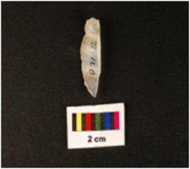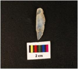 | Description / विवरण | A pen knife with two ridges on dorsal side, diffused bulb on ventral side, blunted right edge and use wear marks along the left cutting edge on dorsal side. |