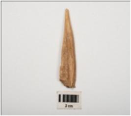 | Description / विवरण | A bone point, made from bone, smoothly polished surface, back side rough and damaged from the surface. |