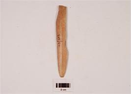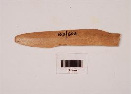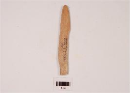 | Description / विवरण | A bone scraper, flat surface, one and is pointed and sharp edges are broken, smooth surface and polished buff in colour. |