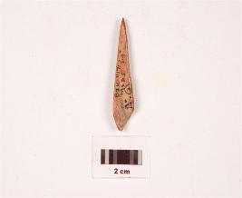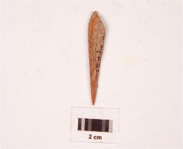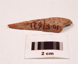 | Description / विवरण | A broken piece of bone tool, cracks and depression on surface, one end is broken, surface is rough and buff in colour. |