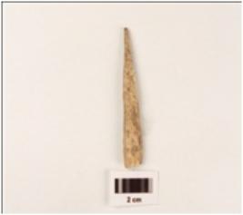 | Description / विवरण | A bone point, polished, intact proximal end, broken distal end, dust deposition on surface. |