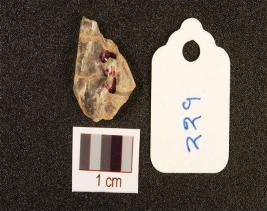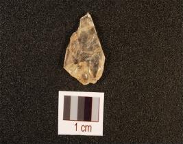 | Description / विवरण | Rock crystal flake with flake scars on surface and use wear marks on working edge, translucent. |