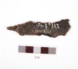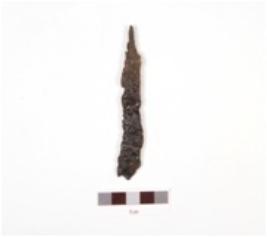 | Description / विवरण | An iron arrow head, pointed top, uneven surface and edges, roughness, rusted, slightly thin in character. |