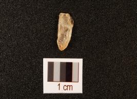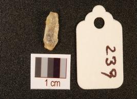 | Description / विवरण | A quartz flake with use wear marks on working edge and flake scars on surface, pointed end. |