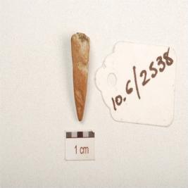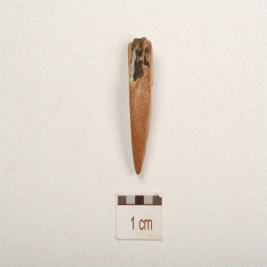 | Description / विवरण | Fragment of a bone point, polished surface with cut marks pointed at one end, broken from other end brown in colour and lenticular in section. |