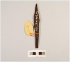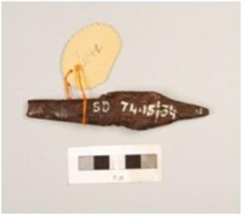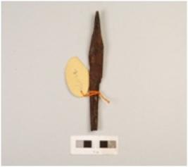 | Description / विवरण | Fragment of iron arrow head, pointed top, flat rod, diamond shaped, cracks on surface, rusted. |