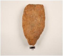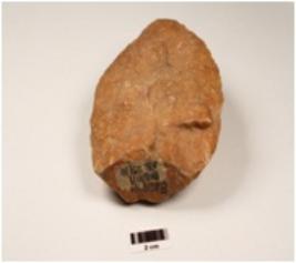 | Description / विवरण | A handaxe made on end struck quartzite flake, use-wear marks on cutting edges, flake scars on one side, plano-convex in section. |