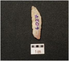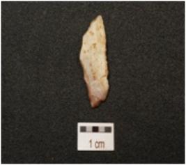 | Description / विवरण | Chert blade with improminent single ridge on dorsal, flattend section and use wear marks on cutting edge. |