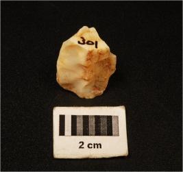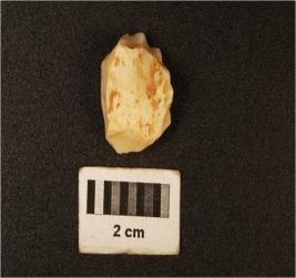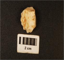 | Description / विवरण | Chert core with eleven flake scars on surface, broken at one end, striking platform visible on other end. |