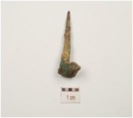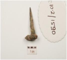 | Description / विवरण | A copper nail, pointed one end other with circular head and circular cross section. |