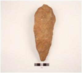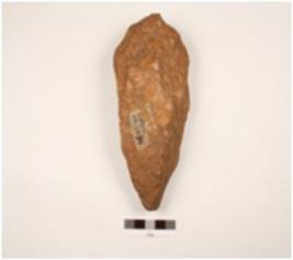 | Description / विवरण | A handaxe made on end struck quartzite flake, wavy marks on cutting edges, diamond shape in section, flake scars on both sides. |
