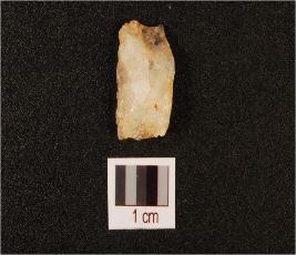| Description / विवरण | A small flake, made on quartz, flake marks on ventral and dorsal, use wear marks on edges. |